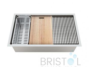 Single Bowl Stainless Steel Undermount Workstation Sink. Components Included: Grid, Colander, Drying Rack and Sink Strainer