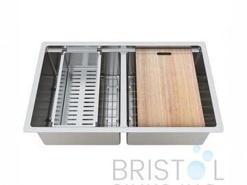 Double Bowl Stainless Steel Undermount Workstation Sink. Components Included: Grid, Colander, Drying Rack and Sink Strainer